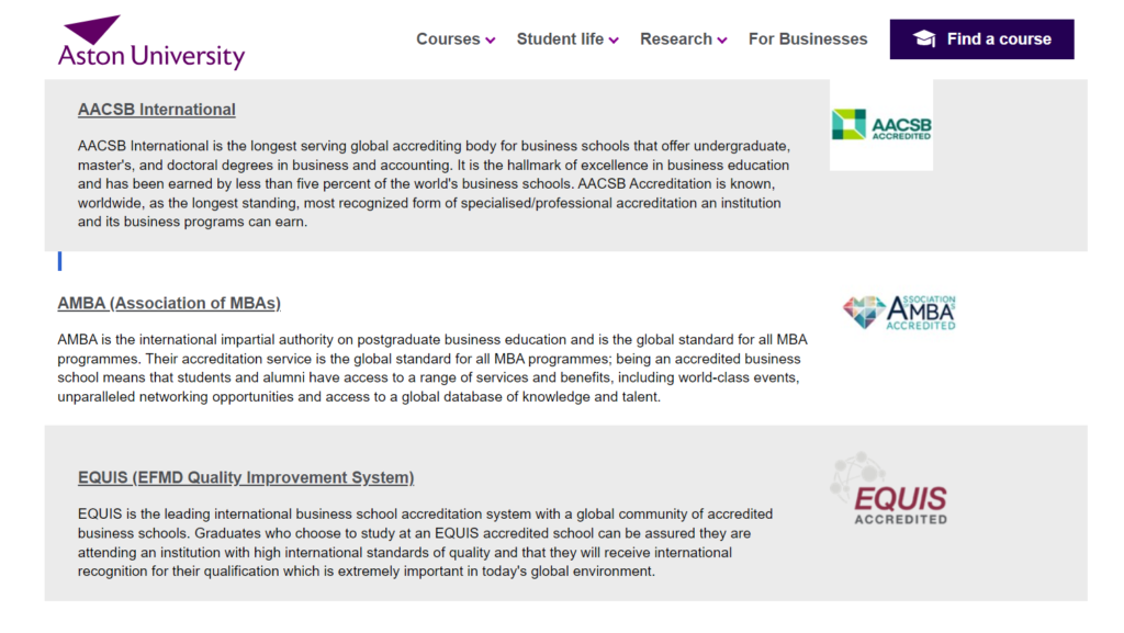 たとえば、Aston UniversityのWebサイトでは、AACSB、AMBA、EQUISという3つの認証機関から認証を受けていることをアピールし、他校との差別化を図っています。