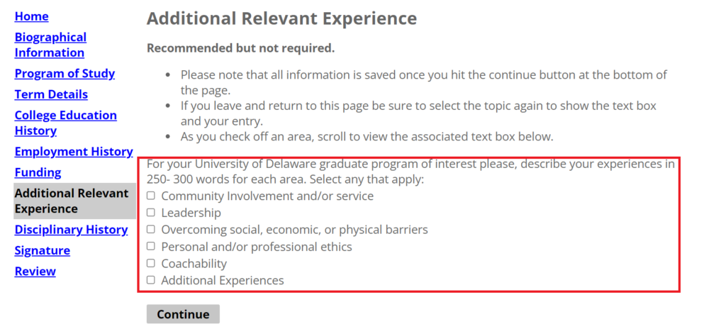 ちなみにエッセイ(同校では”Personal Statement”)も、Delawareのようなプロンプトはなく、任意のテーマで書いたファイルをアップロードするようになっています。