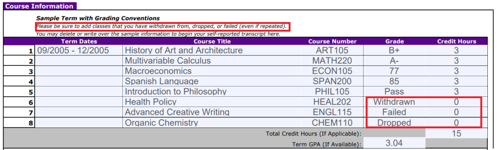 同フォームでは、日本の成績証明書には一般的に記載されない不合格科目についても記載するようになっています。